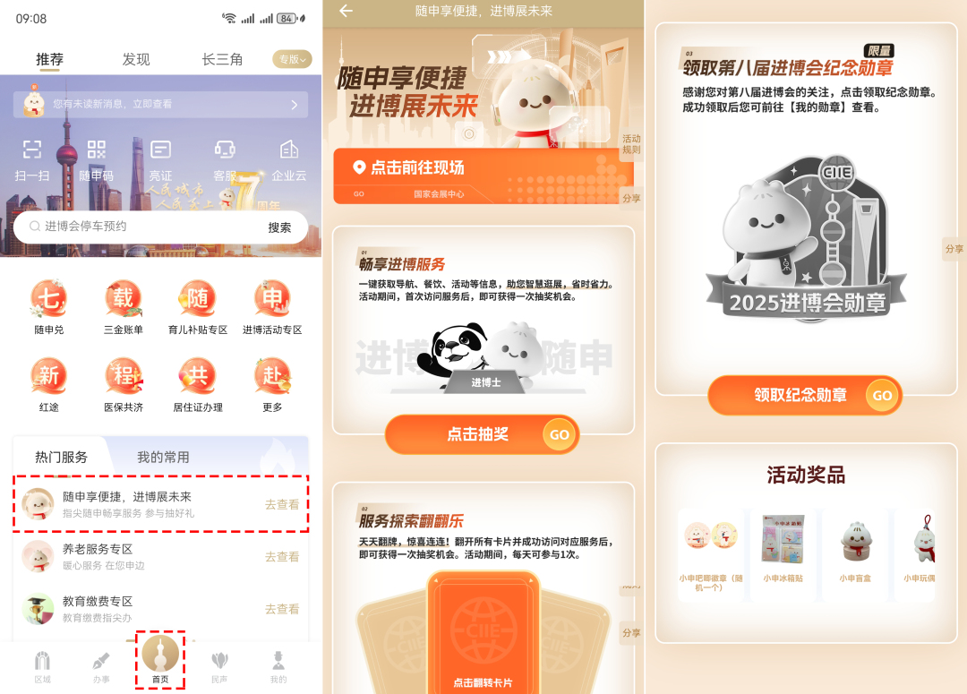 活動期間,登錄“隨申辦市民云”APP→點擊首頁【隨申享便捷,進博展未來】進入活動頁面,完成互動任務即可獲得抽獎機會。