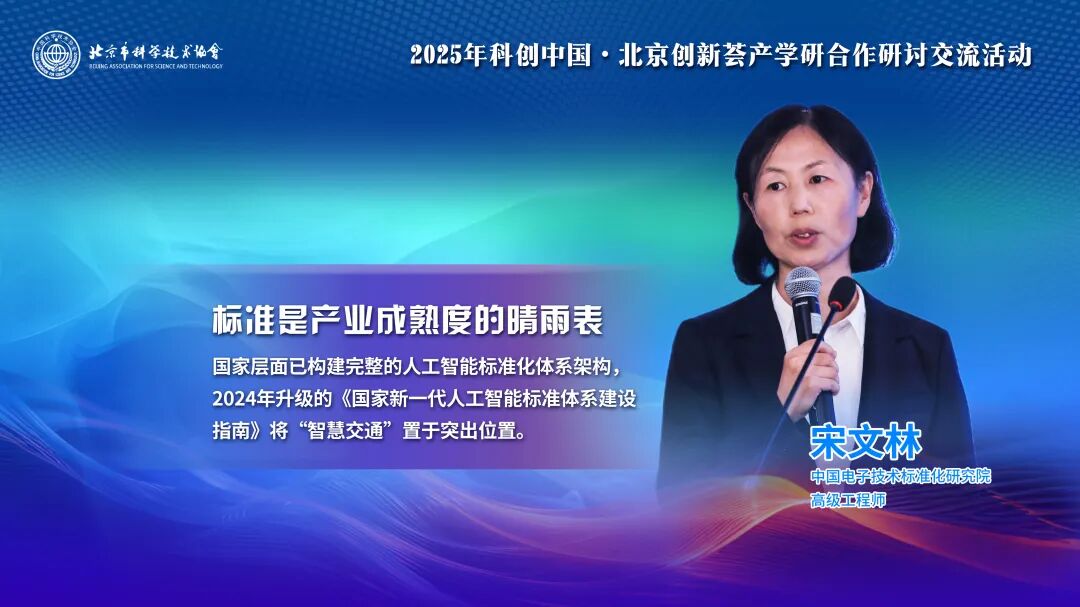 變革離不開標(biāo)準(zhǔn)的引領(lǐng)與規(guī)范。中國(guó)電子技術(shù)標(biāo)準(zhǔn)化研究院高級(jí)工程師宋文林描繪了正在快速成型的人工智能與智慧交通深度融合標(biāo)準(zhǔn)體系藍(lán)圖。“標(biāo)準(zhǔn)是產(chǎn)業(yè)成熟度的晴雨表。我們的工作,就是為這場(chǎng)產(chǎn)業(yè)變革鋪設(shè)‘軌道’。” 宋文林介紹,國(guó)家層面已構(gòu)建完整的人工智能標(biāo)準(zhǔn)化體系架構(gòu),2024年升級(jí)的《國(guó)家新一代人工智能標(biāo)準(zhǔn)體系建設(shè)指南》將“智慧交通”置于突出位置。