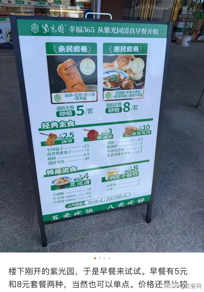 大眾點評上的菜單顯示,紫光園一份“親民”早餐套餐包含油餅、豆漿、糖火燒和茶雞蛋四樣,只要5元,牛肉包子2.5元/個,豆腐腦4元/碗。