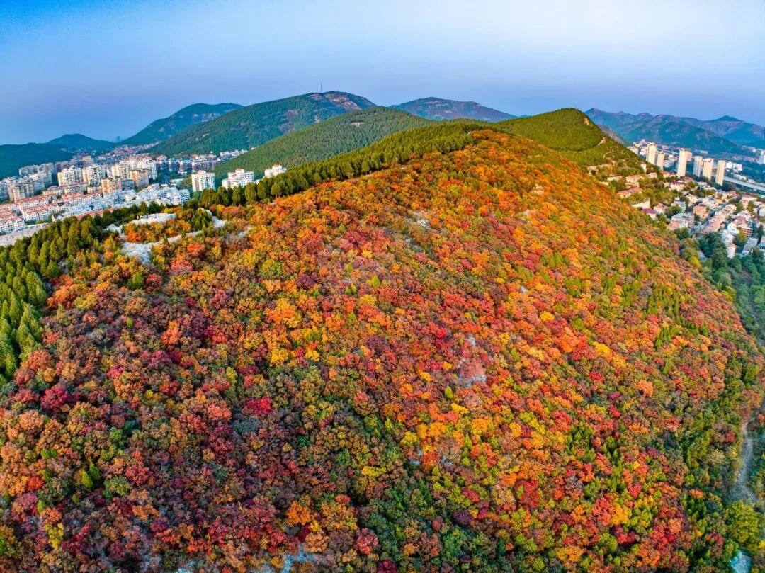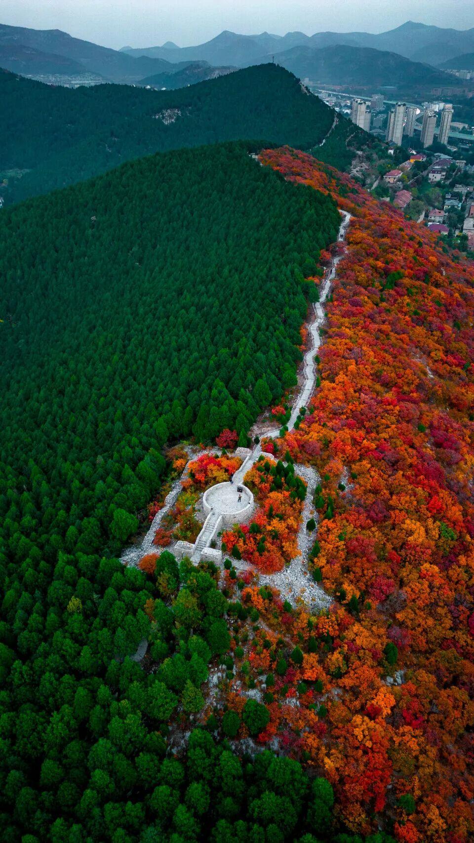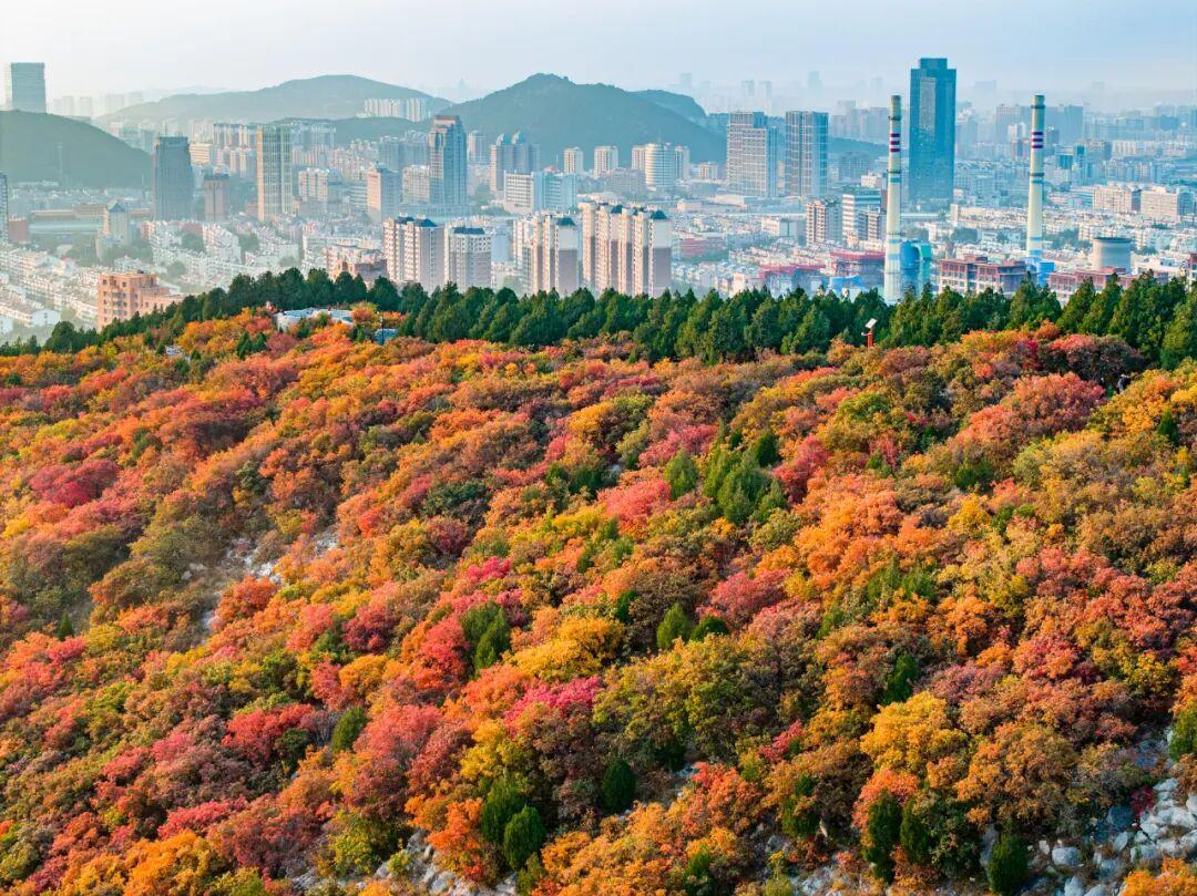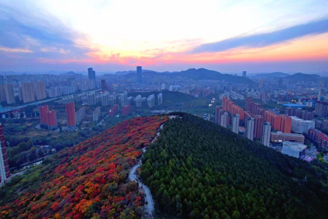 遠(yuǎn)處的城市天際線與近處的紅葉林海