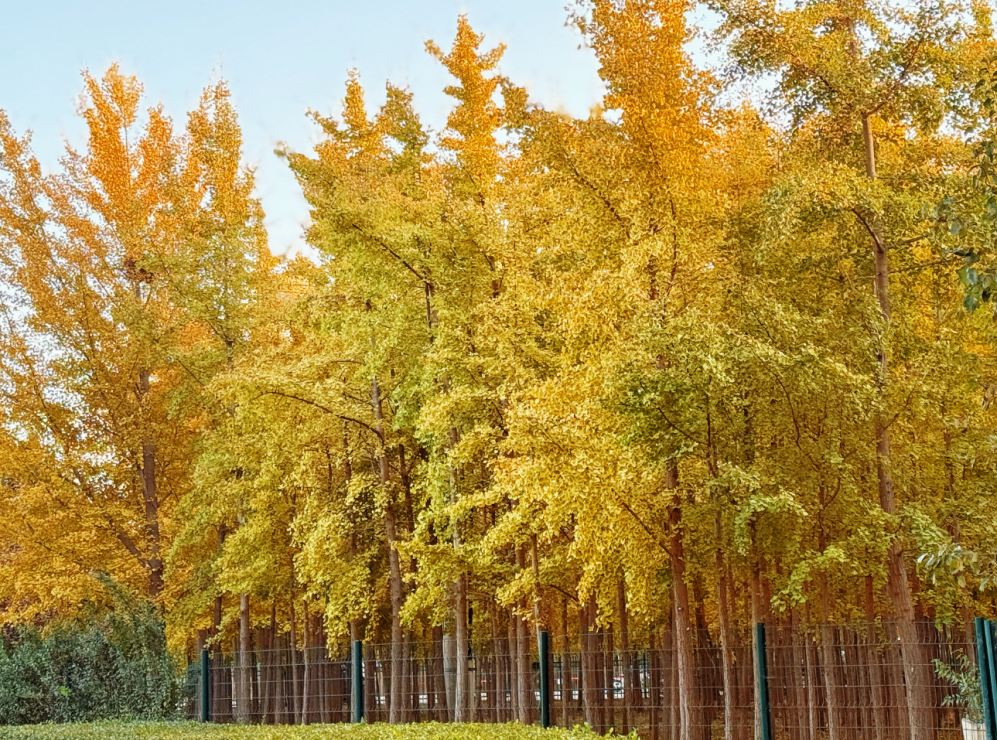 午后的陽光將這片金色海洋照得愈發通透。葉片的紋理清晰可見,像是被精心雕琢的金箔,在微風中輕輕顫動,折射出溫暖的光澤。往來的行人常會放慢腳步,舉起手機記錄這份美好。