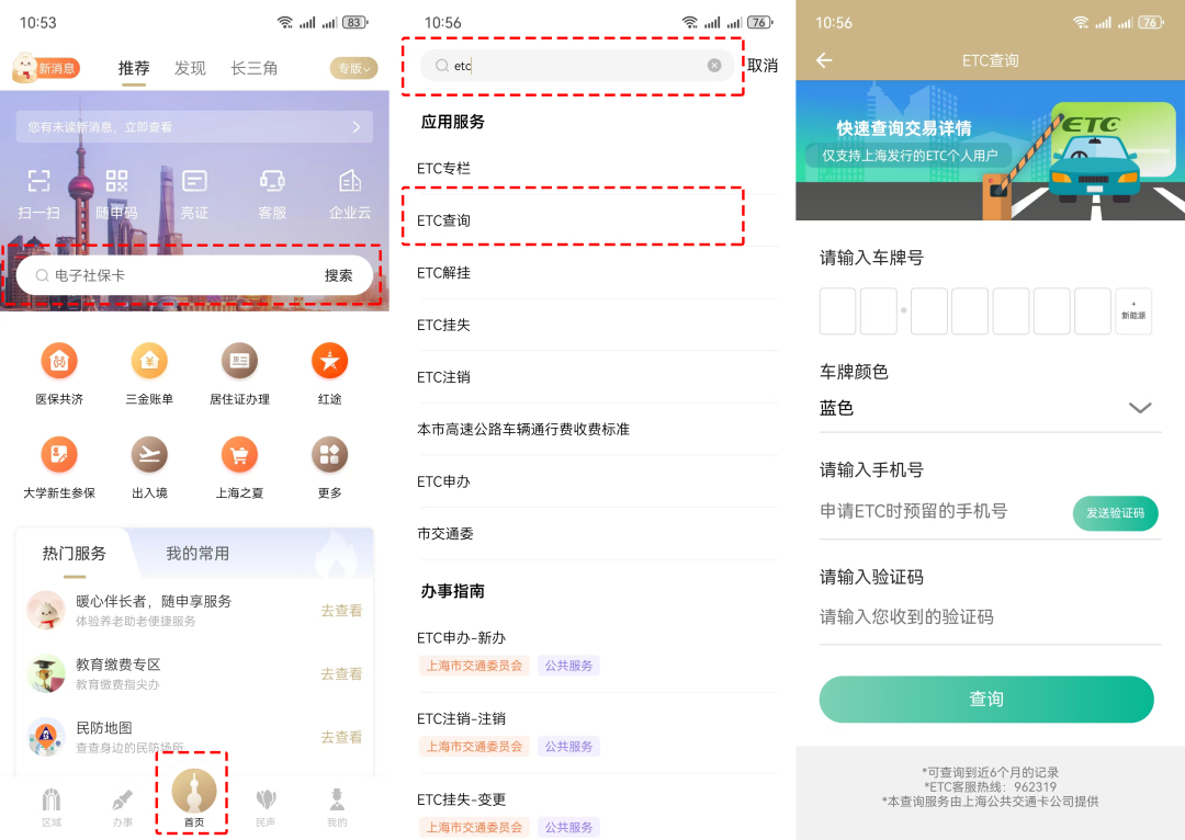 ETC交易記錄查詢:登錄“隨申辦市民云”APP→首頁搜索框中輸入關鍵字“ETC”→點擊進入“ETC查詢”服務頁后,可查詢到近6個月ETC交易記錄。