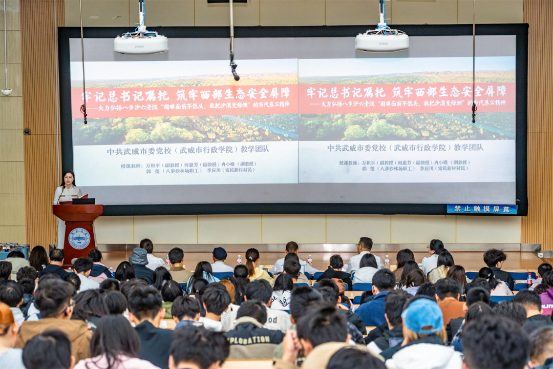 武威市委黨校萬積平副教授生動講述了習近平總書記視察八步沙林場的場景,并介紹了八步沙林場發展歷程,通過一個個治沙故事、一組組發展數據,全面闡釋了八步沙六老漢三代人“困難面前不低頭、敢于把沙漠變綠洲”奮斗精神的科學內涵,使同學們充分認識到黨的領導是生態文明建設的根本保證,“紅色信仰鑄就綠色豐碑”。