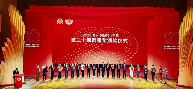 11月4日,由文化和旅游部、重慶市人民政府、四川省人民政府聯合主辦的第二十屆群星獎“大地情深”全國優秀群眾文藝作品展演暨頒獎活動在重慶群星劇場舉行。作為中國群眾文藝領域的最高政府獎,本屆群星獎共有1996個演出單位的5039個作品(團隊)、29.5萬群眾文藝工作者參評,經過初選、復評及終評,最終從全國報送的數千部作品中評選出60個獲獎作品(團隊),音樂、舞蹈、戲劇、曲藝、廣場舞、群眾合唱各10個。