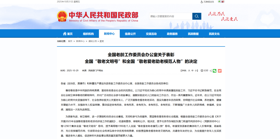 近日,全國老齡工作委員會辦公室公布了全國“敬老文明號”和全國“敬老愛老助老模范人物”表彰名單。此次全國共評選出1290個“敬老文明號”集體與1990 名“敬老愛老助老模范人物。