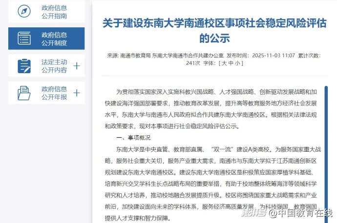 11月3日,南通市教育局發(fā)布《關(guān)于建設(shè)東南大學(xué)南通校區(qū)事項(xiàng)社會(huì)穩(wěn)定風(fēng)險(xiǎn)評(píng)估的公示》。其中提到,東南大學(xué)與南通市人民政府?dāng)M合作共建東南大學(xué)南通校區(qū)。