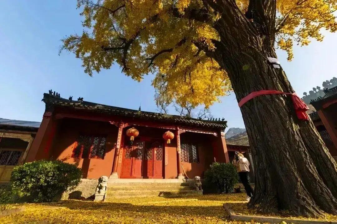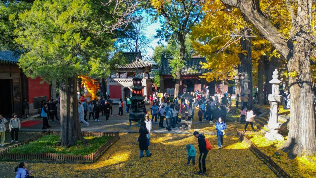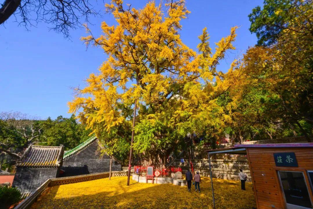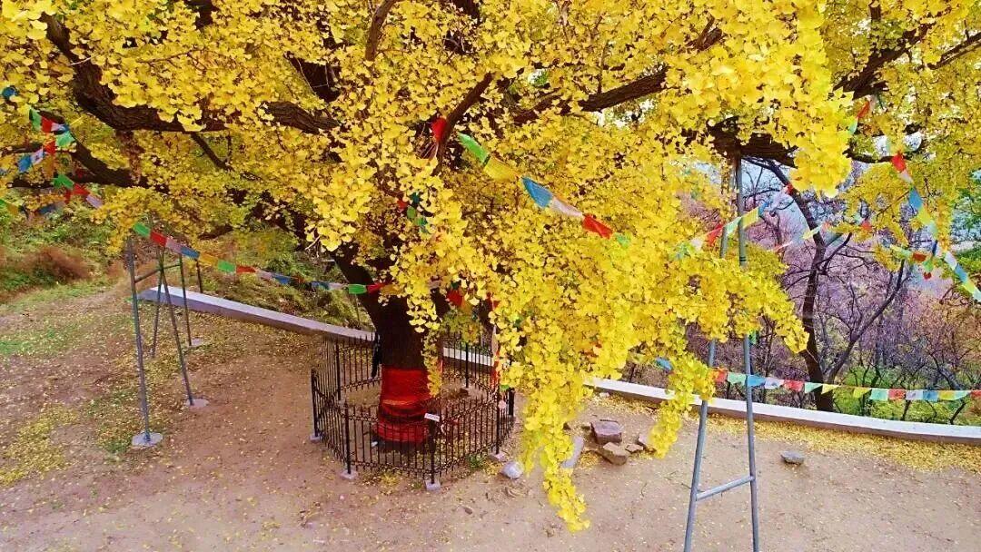 它歷經約1400年歲月沉淀,深秋悄然登場,滿樹金葉如靈動的蝴蝶,紛紛揚揚飄落。