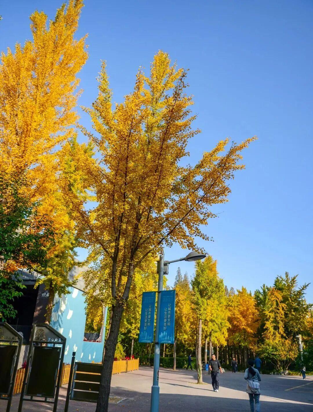秋高氣爽時,從西門步入,金黃的銀杏與湛藍天空交相輝映,公園都被點亮了。