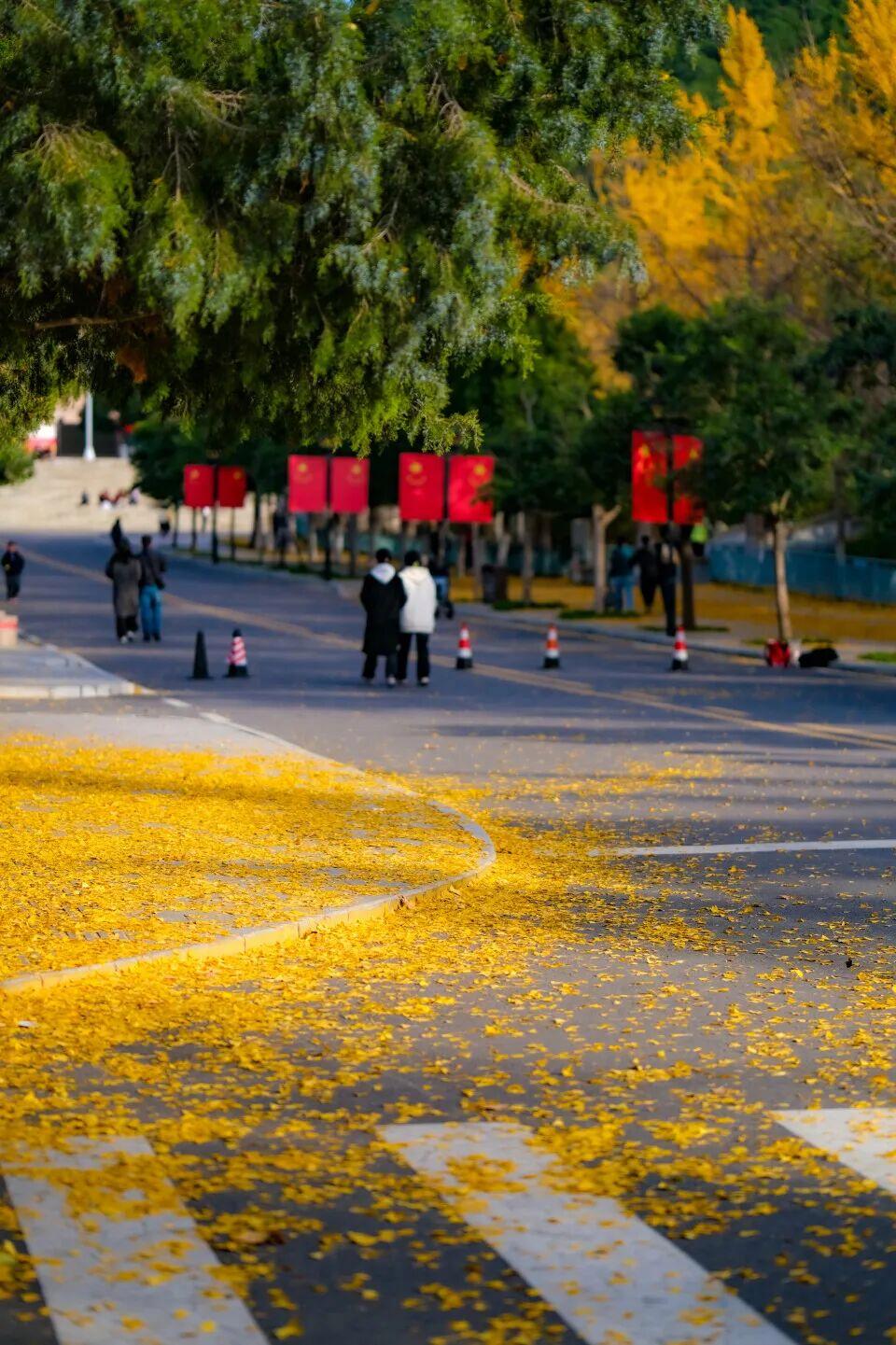漫步其間,行人仿佛誤入童話王國,氛圍感直接拉滿。枝頭掛滿金黃銀杏葉,秋風輕拂,葉片悠悠飄落,像下起一場金色的雨。