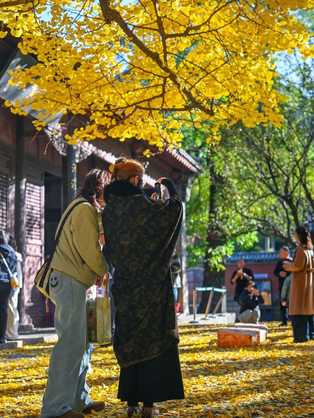 紅墻古院,黛瓦輕煙,與這滿樹金黃相映成趣,繪就一幅靜謐悠遠的秋日圖,讓人流連忘返,沉醉在這份寧靜里。