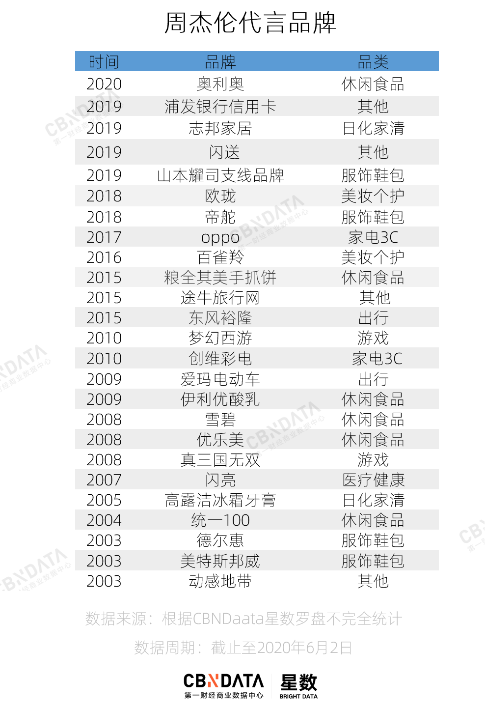 周杰倫曾表示自己接代言的準(zhǔn)則有兩個(gè),一個(gè)是他認(rèn)為厲害的東西,第二就是粉絲都買得起的。據(jù)CBNData星數(shù)的不完全統(tǒng)計(jì),出道20年以來周杰倫至少擁有25個(gè)品牌代言人身份,橫跨家電3C、服飾鞋包、休閑食品等多個(gè)品類。