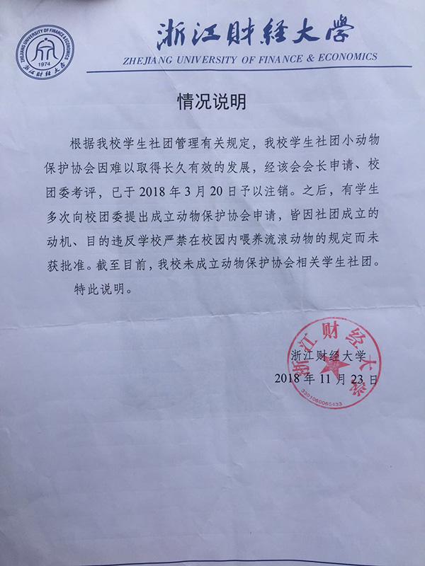 澎湃新聞?dòng)浾攉@取的一份蓋有浙財(cái)大公章、發(fā)布于2018年11月的情況說明顯示,學(xué)校規(guī)定嚴(yán)禁在校園內(nèi)喂養(yǎng)流浪動(dòng)物,有學(xué)生曾多次提出申請(qǐng)未獲批準(zhǔn),截至說明發(fā)布,學(xué)校未成立任何動(dòng)物保護(hù)協(xié)會(huì)相關(guān)學(xué)生社團(tuán)。