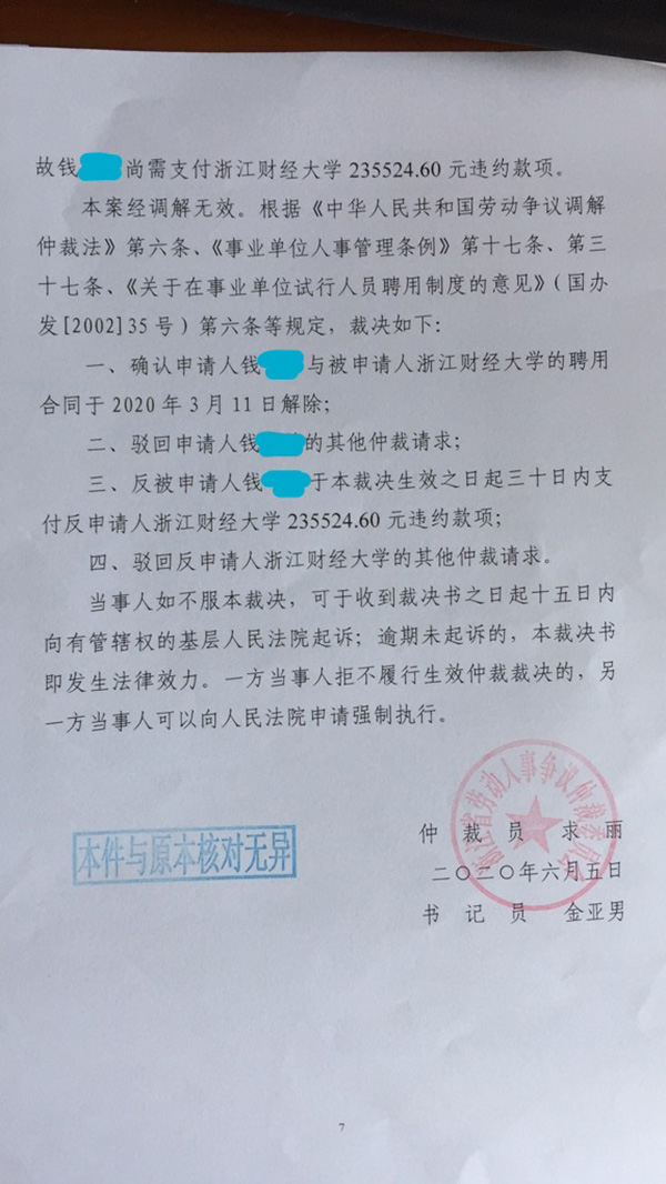 不過裁決書顯示,補(bǔ)充協(xié)議中的違約責(zé)任約定明顯過高,有失公平,錢老師無需再另外支付違約金,只需承擔(dān)剩余服務(wù)期內(nèi)的違約責(zé)任即可。根據(jù)裁決書,浙財(cái)大已向錢老師撥付購房貨幣化安置費(fèi)、安家費(fèi)、科研啟動(dòng)資金共66萬,已履行74個(gè)月服務(wù)期,剩余46個(gè)月,另有近2萬元科研啟動(dòng)資金尚未領(lǐng)取,抵扣后實(shí)際僅需支付235524.6元違約款項(xiàng)。