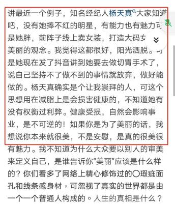 不出意料,微博和知乎的各路人士,紛紛把這次切胃手術歸結到“減肥變美”上。微博上的“七大姑八大姨”紛紛發言規勸,甚至還有知乎網友發文直斥楊天真:“你本來就很美,為什么要為了減肥去切胃?!”