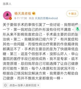 昨晚,娛樂圈頂流經紀人楊天真發文回應要做切胃手術,在社交媒體引起一陣喧嘩。